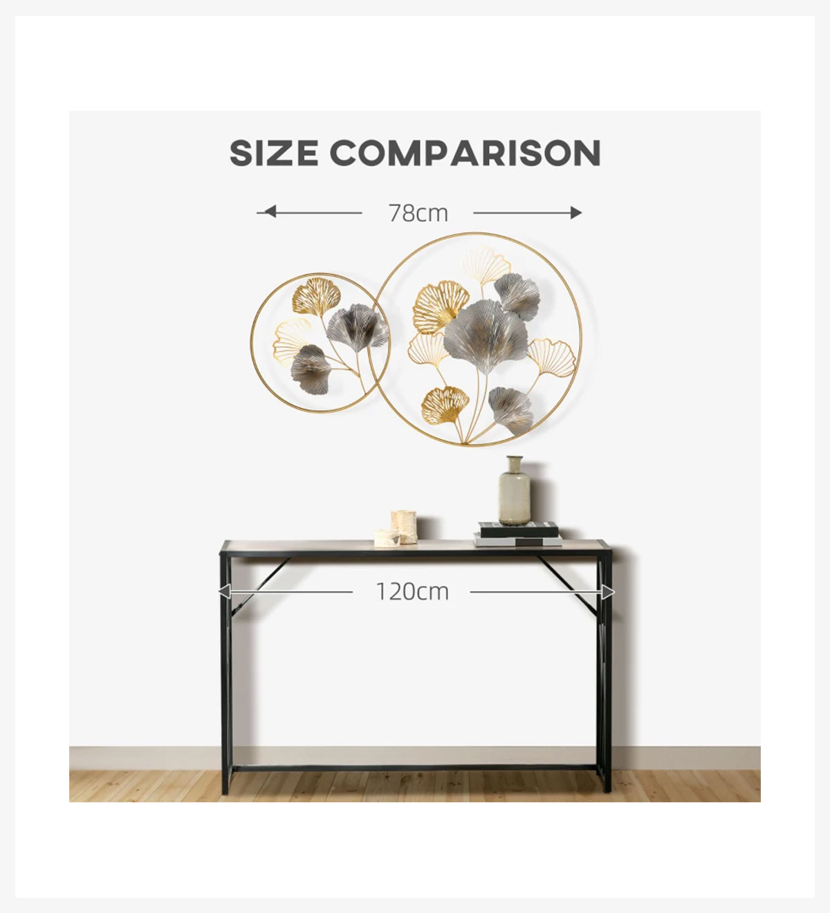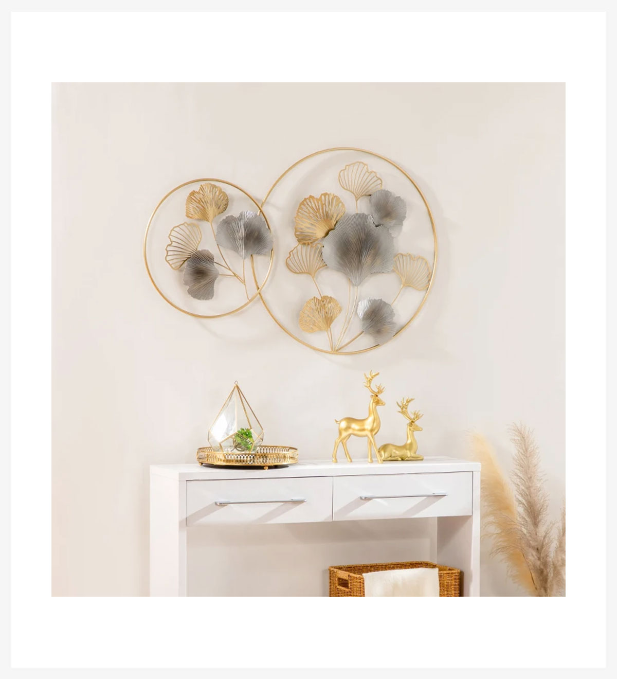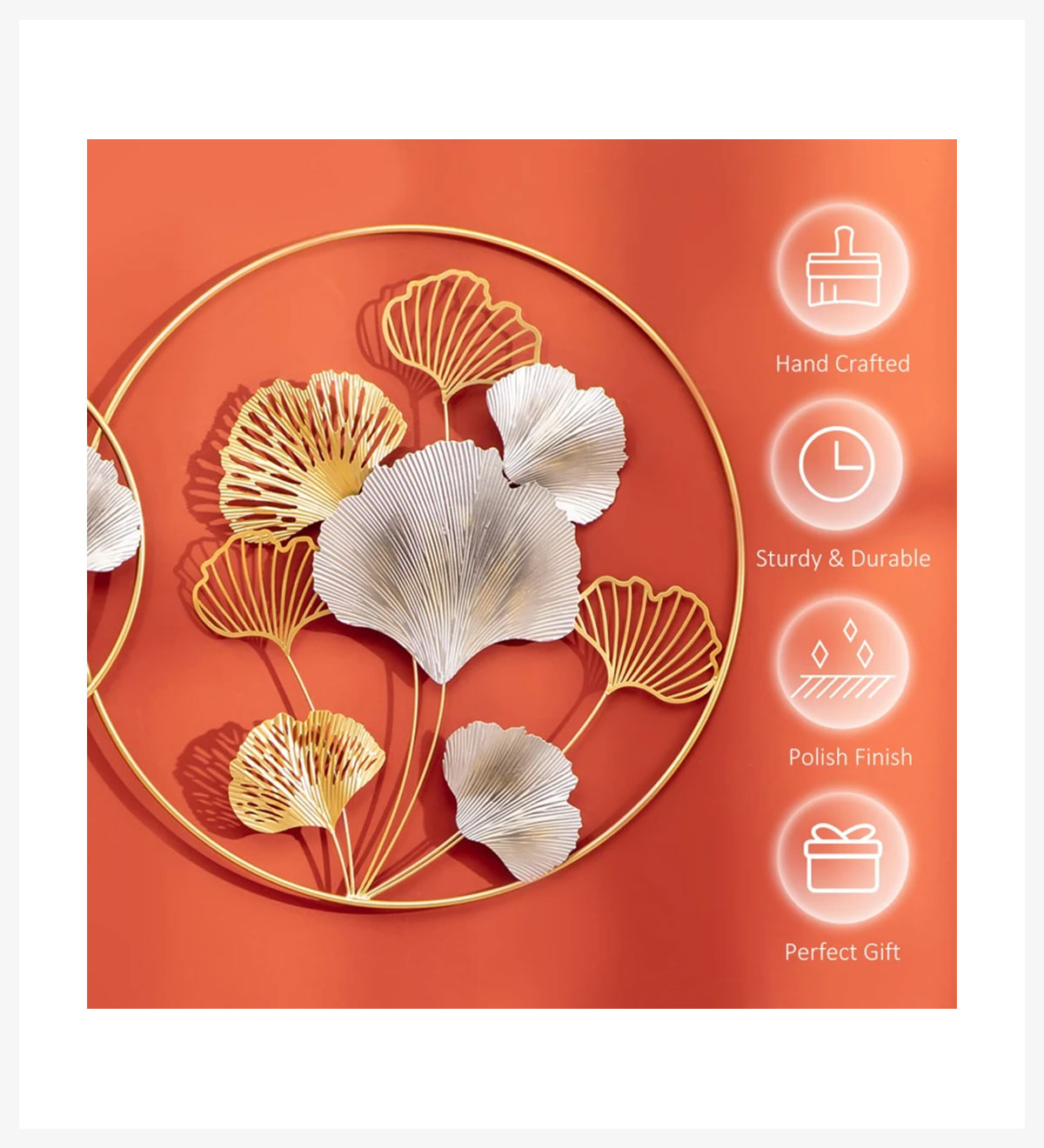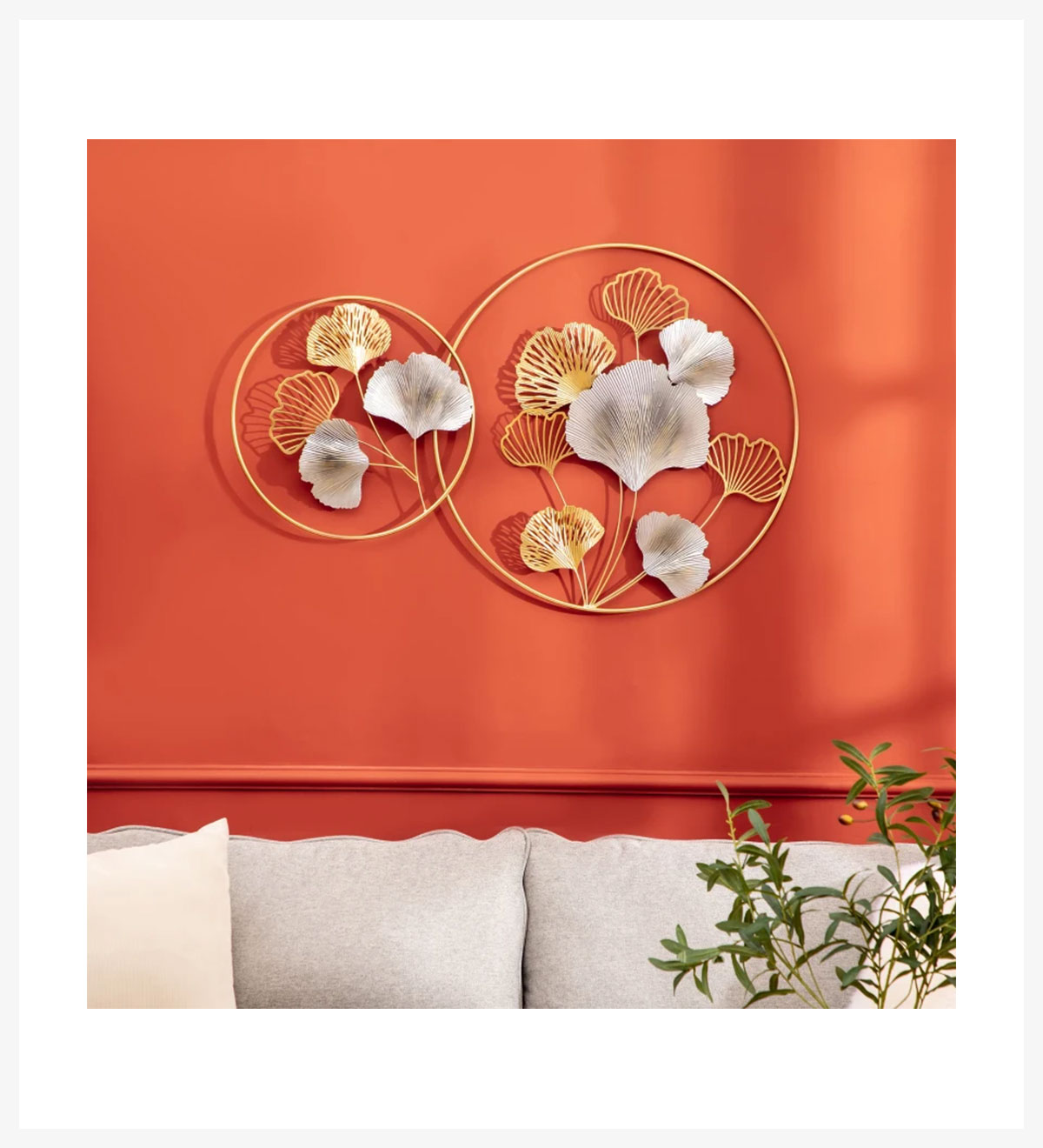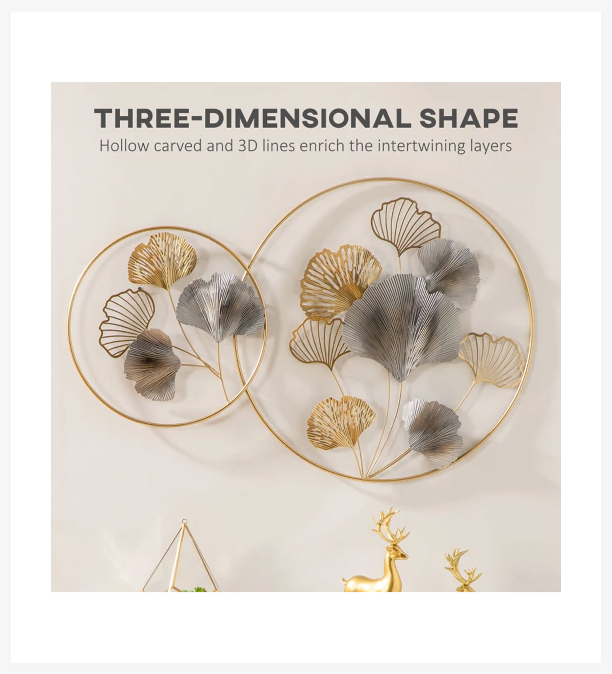 DECORATIUNE 3D: Cu un design scobit cu efect tridimensional, frunze de ginkgo de culoare aurie si metal pictate manual in doua rame rotunde aurii, intruchipeaza un aspect modern care nu se va demoda niciodata