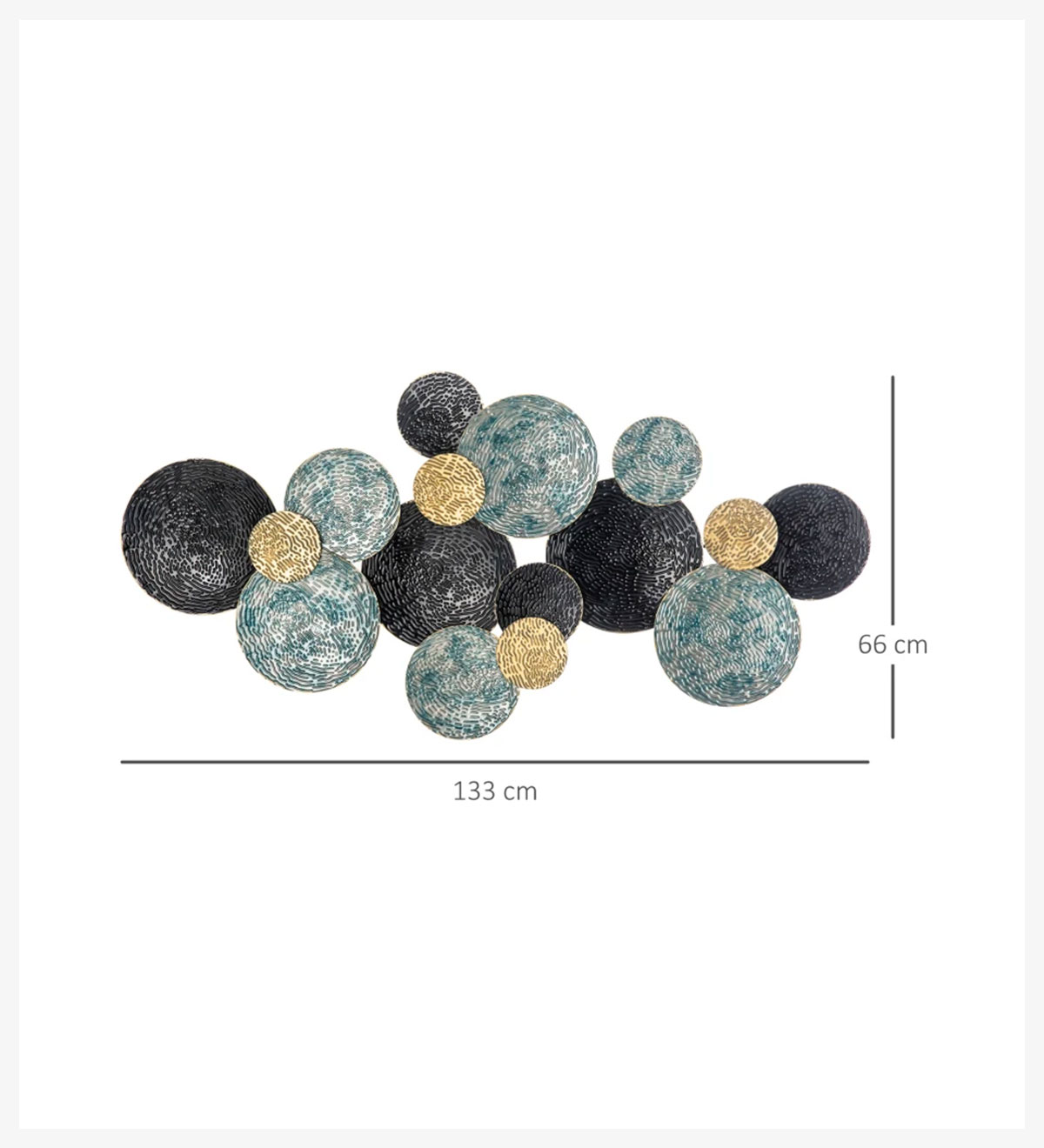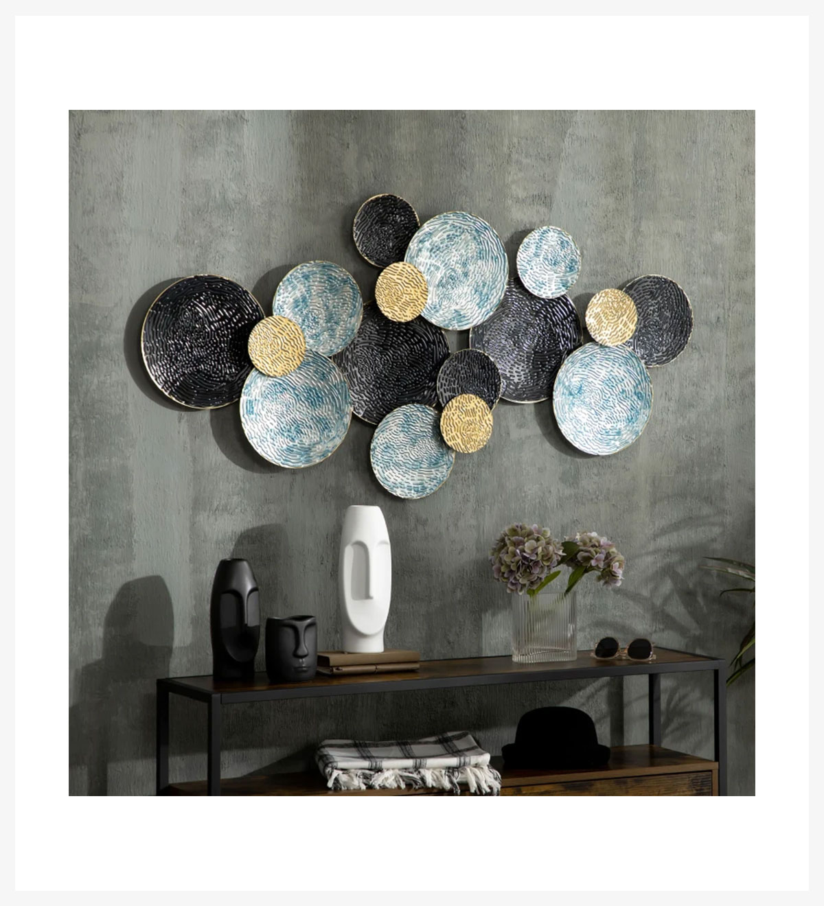 DECORATIUNE DE PERETE: Cu un efect tridimensional, cercuri albastre, aurii si negre pictate manual cu suprafata ondulata de apa, intruchipeaza un aspect modern care nu se va demoda niciodata