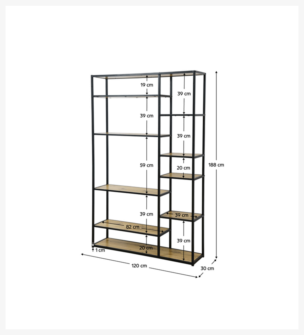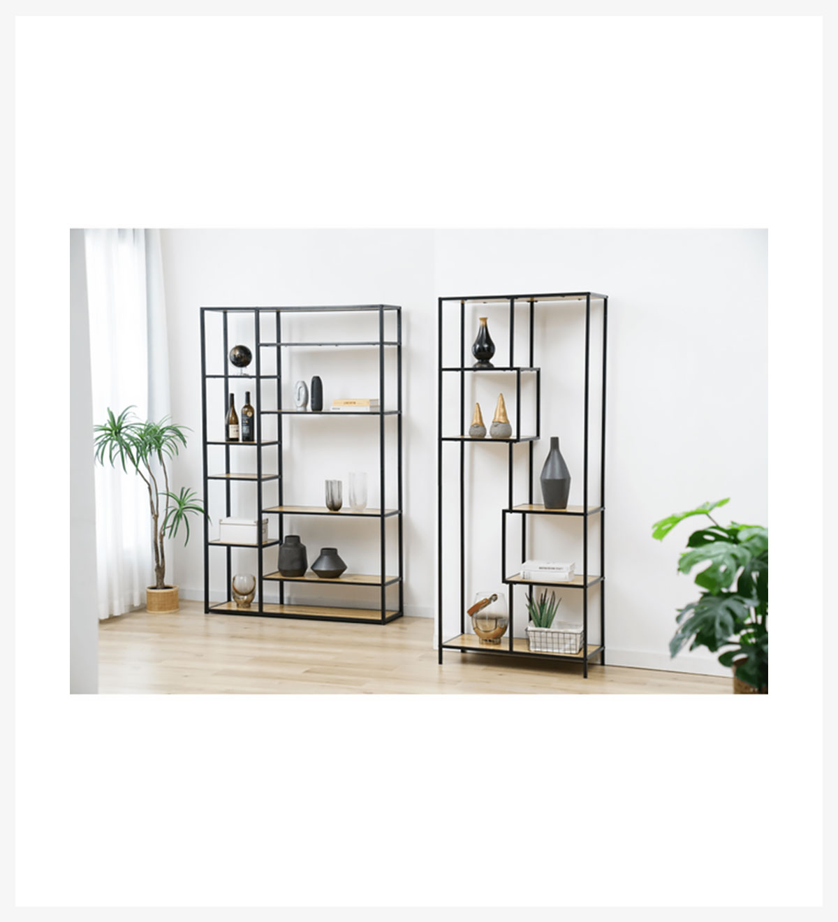 Etajera BILOTE TIP 4 din metal este o piesă de mobilier care îşi va găsi întrebuinţarea în fiecare locuinţă. Spaţiul de depozitare este oferit sub forma a zece rafturi. Structura sa metalică de culoare neagră îi conferă stabilitate şi, în acelaşi timp, un aspect elegant. Este completată cu rafturi din lemn în nuanţa de stejar, datorită cărora va ieşi în evidenţă mai ales în încăperile bine luminate, cu o paletă de culori naturale deschise. Rafturile sunt plasate la înălţimi diferite şi sunt potrivite pentru expunerea decoraţiunilor mici, cutiilor de depozitare, cărţilor sau ghivecelor cu flori. Etajera este ideală pentru sufragerie, dar se potriveşte de asemenea excelent şi în hol, dormitor sau birou.